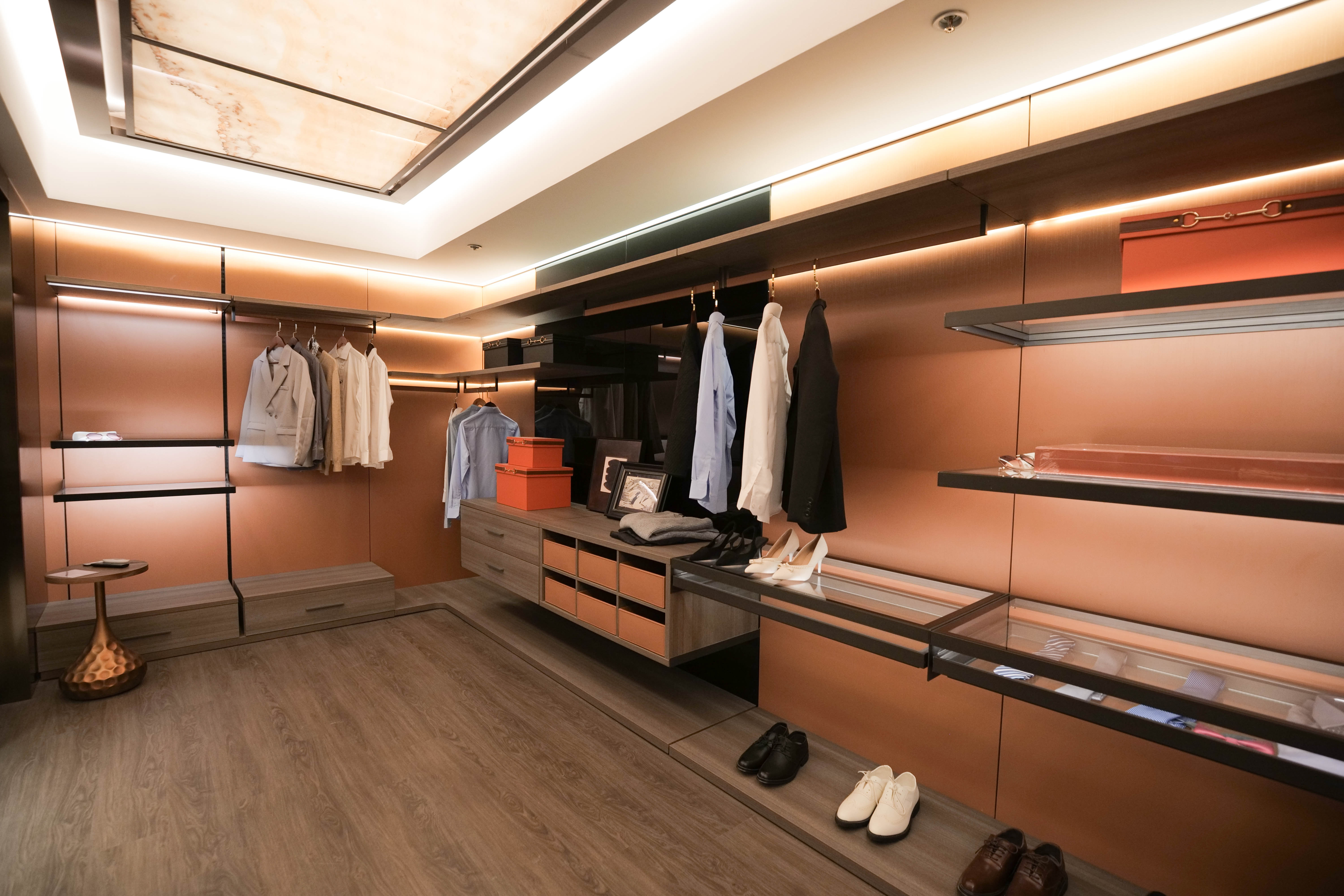 • The ceiling uses light-transmitting panels. The flooring, ceiling, and wall panels all belong to a dedicated walk-in closet system, making the design more professional and targeted.