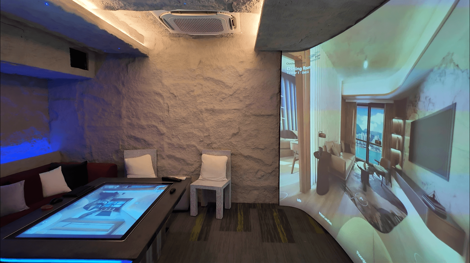 • Real-time aesthetic customization: Customers can use on-site touch control to instantly switch furniture styles or flooring materials, making it easy to compare the sensory effects of different interior schemes. Showroom standard comparison: Quickly switch between the “bare unit handover standard” and the “soft-furnishing show flat,” combined with outdoor aerial real-scene views, so future scenery is visible at a glance. Interactive digital tags: Click the “i” hotspot on furniture to call up digital manuals and gain in-depth understanding of appliance functions and usage instructions.